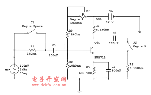 (1) 创建如图所示的共发射极单管放大电路,其中电阻R和开关K用于输入电阻测量,开关K2用于输出电阻测量。
