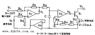 图1是由运放和阻容等元件组成的V/I变换电路,能将0—5V的直流电压信号线性地转换成0-10mA的电流信号,A1是比较器.A3是电压跟随器,构成负反馈回路,输入电压Vi与反馈电压Vf比较,在比较器A1的输出端得到输出电压VL,V1控制运放A1的输出电压V2,从而改变晶体管T1的输出电流IL而输出电流IL又影响反馈电压Vf,达到跟踪输入电压Vi的目的。输出电流IL的大小可通过下式计算:IL=Vf/(Rw+R7),由于负反馈的作用使Vi=Vf,因此IL=Vi/(Rw+R7),当Rw+R7取值为500Ω时,可实现0-5V/0-10mA的V/I转换,如果所选用器件的性能参数比较稳定,运故A1、A2的放大倍数较大,那么这种电路的转换精度,一般能够达到较高的要求。