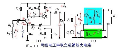 由图Z0303(a)可以看出:Ube = Ui - Uf 即输入端反馈信号与输入信号以电压形式相迭加,故为串联反馈,也可令Ui=0,此时Uf仍能作用到放大电路输入端,故为串联反馈;还可以根据反馈信号引至共射电路发射极则为串联反馈。