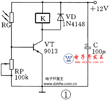 图1是一个简单的亮通开关。RP为光控阈值调节电位器,通过它可调节光控灵敏度(下面几个电路均相同)。白天光线较强,光敏电阻器RG呈低阻值,三极管VT导通,继电器K吸合,其常开触点闭合,接通被控电器工作。夜间,光线较暗,RG呈高电阻,VT截止,K释放,被控电器停止工作。