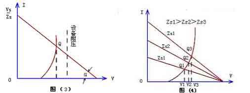 压敏电阻的Zv与电路总阻抗(包括浪涌源阻抗Zs)构成分压器,因此压敏电阻的限制电压为V=VsZv/(Zs+Zv)。Zv的阻值可以从正常时的兆欧级降到几欧,甚至小于1Ω。由此可见Zv在瞬间流过很大的电流,过电压大部分降落在Zs上,而用电器的输入电压比较稳定,因而能起到的保护作用。图(3)所示特性曲线可以说明其保护原理。直线段是总阻抗Zs,曲线是压敏电阻的特性曲线,两者相交于点Q,即保护工作点,对应的限制电压为V,它是使用了压敏电阻后加在用电器上的工作电压。Vs为浪涌电压,它已超过了用电器的耐压值VL,加上压敏电阻后,用电器的工作电压V小于耐压值VL,从而有效地保护了用电器。不同的线路阻抗具有不同的保护特性,从保护效果来看,Zs越大,其保护效果就越好,若Zs=0,即电路阻抗为零,压敏电阻就不起保护作用了。图(4)所描述的曲线可以说明Zs与保护特性之间的关系。