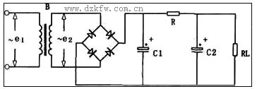 首先从结构上来讲,这种滤波电路是由两个电容器和一个电阻器组成,它实际上就是L形滤波电路中电阻器前面再加个电容器接地就成了π形RC滤波电路。两个电容同时进行滤波作用,后面一个滤波电容可以把前面电容未滤完整的直流电压进一步滤波,这样两个电容同时进行滤波,滤波效果当然是更加理想。可以加大第一只滤波电容的容量来提高滤波效果,但第一只滤波电容的容量不能太大,因为刚开机接通电源时,第一只滤波电容容量太大的话充电时间会太长,这一充电电流是流过整流二极管的,当充电电流太大、持续时间太长时,会损坏整流二极管,所以采用这种π形RC滤波电路时,可以使第一只电容容量略有减少,通过调整后面的L形RC滤波电路来提高滤波效果。