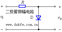 一种简单的限幅电路如图所示。当vI小于二极管导通电压时,二极管不导通,vO » vI;当vI超过二极管的导通电压vD,二极管导通,其两端电压就是vD。由于二极管正向导通后,其两端电压变化很小,所以当vI有很大变化时,vO的值却被限制在一定范围内。这种电路可用来减少某些信号的幅值,以适应不同的要求或保护电路中的元器件。
