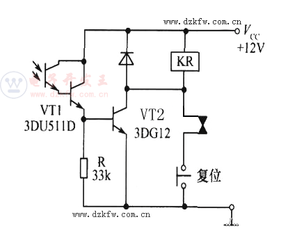 三极管自锁电路:本电路由三个三极管和二极管以及电阻组成。光敏三极管组成的带自锁功能的光控继电器开关电路图