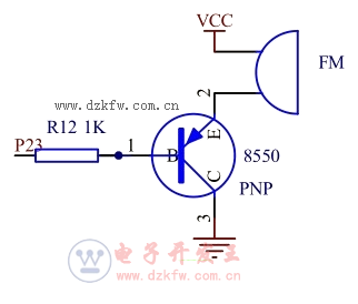 FM是一个蜂鸣器,8550是一个PNP型的三极管,C端接地,B端由单片机控制,E端通过FM接VCC。根据箭头的方向,E端高电压的时候,当B端也是高电压,那么E和C之间是断开的,当B端是低电压,那么E和C直接导通,实现开关的作用。简单的技巧:三极管上箭头所在方向的二极管,只要二极管正向导通,那么三极管上下就能导通。