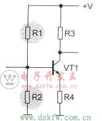 (2)从基极出发,将基极与电源端(+V端或-V端)相连的所有元件找出来,如下图所示电路中的R1,再将基极与地线端相连的所有元件找出来,如电路中的R2,R2与地线相连,这些元器件构成基极偏置电路的主体电路。
