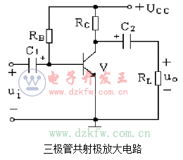 在三极管其射极放大电路中,三极管V的作用是实现电流的放大。集电极直流电源UCC则能够确保三极管工作在放大状态。在该电路系统中,集电极负载电阻RC负责将三极管集电极电流变化转变为电压变化,以实现电压放大。基极偏置电阻RB为放大电路提供静态工作点。耦合电容C1和C2的作用则是隔直流通交流。当这一电路接通后,ui直接加在三极管V的基极和发射极之间,引起基极电流iB作相应的变化,通过V的电流放大作用,V的集电极电流iC也将变化。而iC的变化引起V的集电极和发射极之间的电压uCE变化。此时,uCE中的交流分量uce经过C2畅通地传送给负载RL,成为输出交流电压uo,由此实现了电压放大作用。