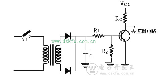 反之,若微动开关开启,变压器便不通电,而使三极管截止,此时集电极电压便上升至VCC值,此一VCC信号,可被送入逻辑电路中,藉以表示微动开关处于开启状态。在图11之中,逻辑电路被当作三极管的负载,连接于集电极和地之间(如图11) ,因此三极管开关电路的R1,R2和RC值必须慎加选择,以保证三极管只工作于截止区与饱和区,而不致工作于主动(线性) 区内。