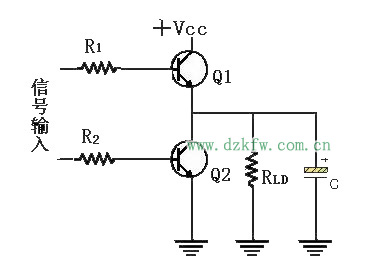 图腾式电路是将一只三极管直接迭接于另一三极管之上所构成的,它也因此而得名。欲使负载获能,必须使Q1三极管导通,同时使Q2三极管截断,如此负载便可经由Q1而连接至VCC上,欲使负载去能,必须使Q1三极管截断,同时使Q2三极管导通,如此负载将经由Q2接地。由于Q1的集电极除了极小的接点电阻外,几乎没有任何电阻存在(如图9所示) ,因此负载几乎是直接连接到正电源上的,也因此当Q1导通时,就再也没有电容的慢速充电现象存在了。所以可说Q1“将负载拉起”,而称之为“挽起 (pull up) 三极管”,Q2则称为“拉下(pull down) 三极管”。图9左半部的输入控制电路,负责Q1和Q2三极管的导通与截断控制,但是必须确保Q1和Q2使不致同时导通,否则将使VCC和地之间经由Q1和 Q2而形同短路,果真如此,则短路的大电流至少将使一只三极管烧毁。因此图腾式三极管开关绝对不可如图6-4般地采用并联方式来使用,否则只要图腾上方的三极管Q1群中有任一只导通,而下方的Q2群中又恰好有一只导通,电源便经由导通之Q1和Q2短路,而造成严重的后果。