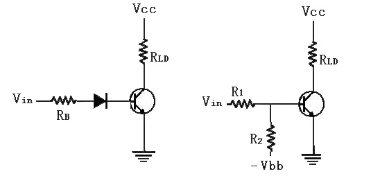 图6(a) 的电路,在基射极间串接上一只二极管,因此使得可令基极电流导通的输入电压值提升了0.6伏特,如此即使Vin值由于信号源的误动作而接近0.6伏特时,亦不致使三极管导通,因此开关仍可处于截止状态。图6(b)的电路加上了一只辅助-截止(hold-off)电阻R2,适当的R1,R2及Vin值设计,可于临界输入电压时确保开关截止。由图6(b)可知在基射极接面未导通前(IB0),R1和R2形成一个串联分压电路,因此R1必跨过固定(随Vin而变) 的分电压,所以基极电压必低于Vin值,因此即使Vin接近于临界值(Vin=0.6伏特) ,基极电压仍将受连接于负电源的辅助-截止电阻所拉下,使低于0.6伏特。由于R1,R2及VBB值的刻意设计,只要Vin在高值的范围内,基极仍将有足够的电压值可使三极管导通,不致受到辅助-截止电阻的影响。