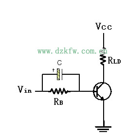 在要求快速切换动作的应用中,必须加快三极管开关的切换速度。图7为一种常见的方式,此方法只须在RB电阻上并联一只加速电容器,如此当Vin由零电压往上升并开始送电流至基极时,电容器由于无法瞬间充电,故形同短路,然而此时却有瞬间的大电流由电容器流向基极,因此也就加快了开关导通的速度。稍后,待充电完毕后,电容就形同开路,而不影响三极管的正常工作。