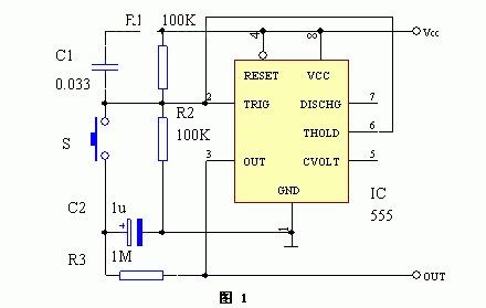电路见图1(点击下载原理图)。电路刚通电时,C1的存在使IC(555)⑥脚获得一正脉冲,其③脚输出低电平,此时C2上无电压。按一下轻触键S,C2上“0”电平作用于IC的②脚,③脚翻转为高电平,通过R3对C2充电。S释放后,C2充电到Vcc,而IC的②、⑥脚被R1、R2偏置于1/2Vcc,③脚高电平状态保持不变。再按一下S,C2上电压使IC⑥脚电压大于2/3Vcc,③脚又翻转为低电平。S释放后,C2上电压通过R3、IC③脚放电,②、⑥脚的电压仍为1/2Vcc,③脚低电平的状态可维持不变。由此可见,每按S一次,IC③脚高、低电平就变换一次。