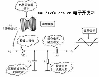 (3)检波电路输出信号中还有高频载波信号,这一信号无用,通过接在检波电路输出端的高频滤波电容C1,被滤波到地端。