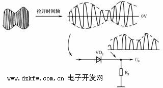从展开后的调幅信号波形中可以看出,它是一个交流信号,只是信号的幅度在变化。这一信号加到检波二极管正极,正半周信号使二极管导通,负半周信号使二极管截止,这样相当于整流电路工作一样,在检波二极管负载电阻R1上得到正半周信号的包络,即信号的虚线部分,见图中检波电路输出信号波形(不加高频滤波电容时的输出信号波形)。