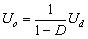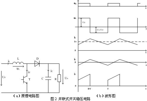 式(4)表明串联式开关稳压电路输出电压平均值正比于占空比D。当D从0变到1时,Uo从0变到Ud,且输出电压最大不超过Ud。由于变换器的输出电压总是小于输入电压,故串联式开关稳压电路也称降压变换器。工作中输入电流在开关闭合时大于0,在开关断开时等于0,因此降压变换器的输入电流是脉动的。对于脉动电流,在实际应用中应加以限制,否则会影响到其它电器的正常工作。不过输出电流在电感L以及二极管D和电容C的作用下却是连续、平稳的。