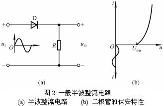 在图2(a)所示为一般半波整流电路,由于二极管的伏安特性如图(b)所示,当输入电压uI幅值小于二极管的开启电压Uon时,二极管在信号的整个周期均处于截止状态,输出电压始终为零。即使uI幅值足够大,输出电压也只反映uI大于Uon的那部分电压的大小。在uI与Uon相差不大时,输出整流波形在零区附近的失真非常明显。因此,该电路不能对微弱信号整流。
