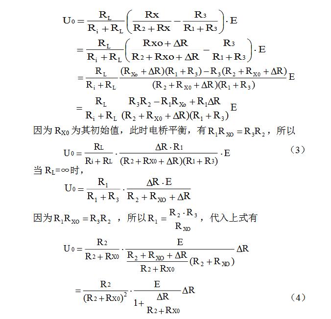 电桥的四个桥臂阻值相等,即R1=R2=R3=RX0;其中RX0是RX的初始值,这时电桥处于平衡状态,U0=0。