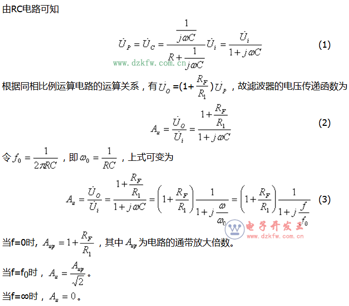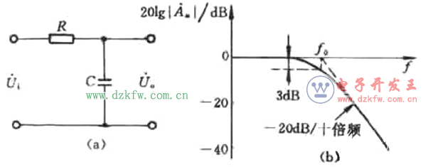 利用集成运放与RC低通电路一起,可以组成有源滤波器,以提高通带电压放大倍数和带负载能力。上图(a)示出了一阶低通有源滤波器的电路图。