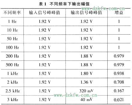 由表1可以看出,当输入频率f=100 Hz、f截止=200 Hz时输出信号开始衰减,当f=f截止=2 kHz时,输出信号的幅值为输入信号的0.707倍,符合低通滤波电路的幅频特性,保证了滤波电路的截止频率为2 kHz。