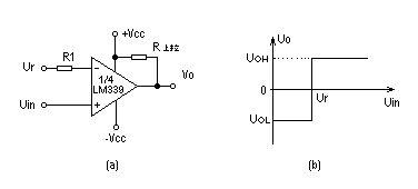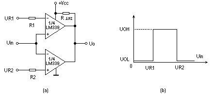R1<Uin<UR2),输出为高电位(UO=UOH)。当Uin不在门限电位范围之间时,(Uin>UR2或Uin<UR1)输出为低电位(UO=UOL),窗口电压ΔU=UR2-UR1。它可用来判断输入信号电位是否位于指定门限电位之间。