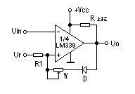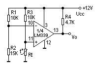 图3为某仪器中过热检测保护电路。它用单电源供电,1/4LM339的反相输入端加一个固定的参考电压,它的值取决于R1于R2。UR=R2/(R1+R2)*UCC。同相端的电压就等于热敏元件Rt的电压降。当机内温度为设定值以下时,“+”端电压大于“-”端电压,Uo为高电位。当温度上升为设定值以上时,“-”端电压大于“+”端,比较器反转,Uo输出为零电位,使保护电路动作,调节R1的值可以改变门限电压,既设定温度值的大小。