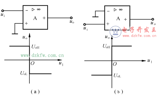 传输特性是比较器的输出电压uo与输入电压ui在平面直角坐标上的关系。