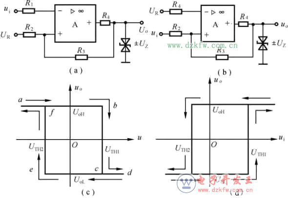 形成电压传输特性上defa段。由于它与磁滞回线形状相似,故称之为滞回电压比较器。