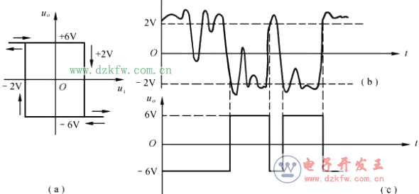 例如,滞回比较器的传输特性和输入电压的波形如图6(a)、(b)所示。根据传输特性和两个阈值(UTH1=2V, UTH2=–2V),可画出输出电压uo的波形,如图6(c)所示。从图(c)可见,ui在UTH1与UTH2之间变化,不会引起uo的跳变。但回差也导致了输出电压的滞后现象,使电平鉴别产生误差。