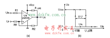 图1a给出了一个迟滞比较器,人们所熟悉的“史密特”电路即是有迟滞的比较器。图1b为迟滞比较器的传输特性。