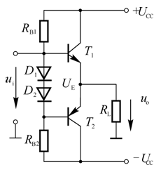 当有输入信号时,因二极管D1和D2的动态电阻很小,对于交流信号而言,D1和D2相当于短路。在输入信号的正半周,两个晶体管的基极电位升高,使得T1由微导通变为导通,T2截止,负载RL上流过 而获得输出电压的正半周;在输入信号的负半周,两个晶体管的基极电位降低,使得T1截止而T2由微导通变为导通,负载RL上反向流过 而获得输出电压的负半周。值得注意的是,这种放大电路在设置静态工作点时,应尽可能接近乙类状态,否则会影响效率的提高。