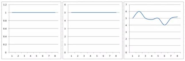 如果一个放大倍数为5的放大器,输入恒定的1V电压(波形如下左图),则输出应该始终是5V(波形如下中图),既不会随时间改变,也不会随温度而变化,输出和输入的电压形状完全一样。但如果放大倍数不稳定,不断变化,原先输入的信号就会变形(如下右图),信号可能由一条水平直线变成了一条曲线。这种波形变化叫做失真。