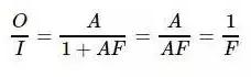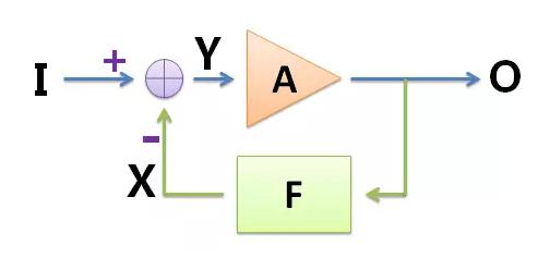 方框F是反馈器件,表示从输出O取出信号,并将其与F相乘,得到X,所以X=O∗F,这里F小于1(这个部分在实际电路中可以用电阻实现);