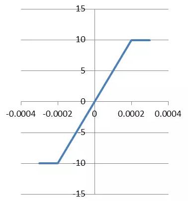 通常运放有两个输入端U+和U−,一个输出端Uo,它们之间满足Uo=A∗(U+−U−)运放开环增益A常常高达几十万~几百万,但运放的输出电压受电源电压限制,不能超出电源电压。于是运放的输入-输出关系类似下图形状。