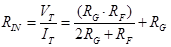 对于差分输入、差分输出的放大器,其差模输入阻抗和共模输入阻抗与图1的计算方法与计算结果都相同,Rid=2Rg,Ric=(Rg+Rf)/2。这种放大器经常用于差分信号转换为单端信号,通常将同相端接地,反相端输入信号,这就需要计算从同相端看进去的单端口输入阻抗。将-Din接地,+Din给一个测试信号VT,流入放大器的电流为IT,运用虚短、虚断公式(注意Vout为+½Vo和-½Vo),有: