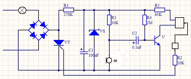 电路图如上图所示,220V交流电通过灯泡H及整流全桥后,变成直流脉动电压,作为正向偏压,加在可控硅VS及R支路上。声控电路由传感器BM,晶体管V和IC内电路(与非门)组成。当有脚步声或拍手声时,则该声音信号经过传感器BM转换为电信号后,再经过电容C2加至V的基极,使V瞬间截止,V的集电极突变为高电平,使可控硅VS触发导通,灯泡H发光。