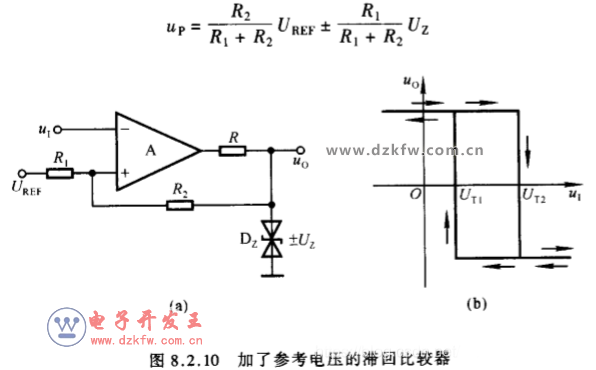 (2)、写出集成运放同相输入端、反向输入端电位Up和Un的表达式,令Up=Un,解得输入电压Ui就是阈值电压Ut;