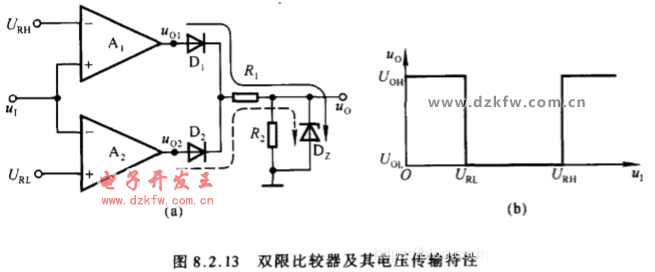 (1)、通过研究集成运放输出端所接的限幅电路来确定电压比较器的输出低电平Uol和输出高电平Uoh;