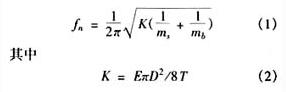 式中: K为圆板形压电晶体片的刚度;ms为惯性质量块的质量;E为压电晶体片的杨氏模量;D为压电晶体片的直径;t为各晶体片的厚度;mb为传感器基座和壳体的质量。??