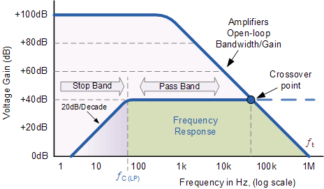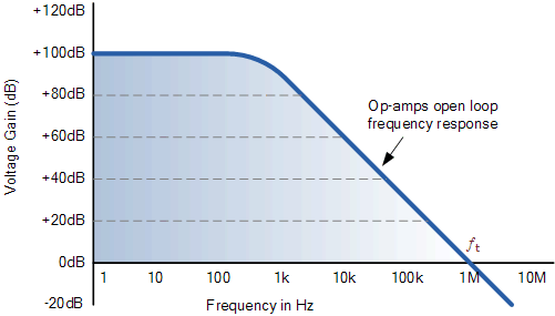 常用的运算放大器如uA741具有典型的“开环”(无任何反馈),最大约100dB的直流电压增益,在-20dB / Decade的滚降率下降低(-6db / Octave)随着输入频率的增加。 uA741的增益降低,直到达到单位增益(0dB)或其“转换频率”(ƒt),大约为1MHz。这使得运算放大器的频率响应曲线与一阶低通滤波器非常相似,如下所示。