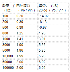 频率响应波特图的数据可以通过将上面获得的值在100Hz到100kHz的频率范围内代入电压增益的公式来获得: