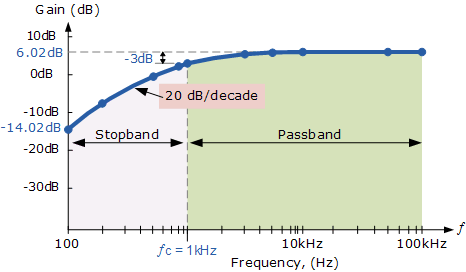 对于一阶滤波器,滤波器的频率响应曲线增加20dB / decade或6dB /倍频程,直到确定的截止频率点,该频率点始终低于最大增益值-3dB。与之前的滤波器电路一样,可以使用相同的公式找到较低的截止频率或转角频率(ƒc):
