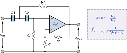 从技术上讲,没有一个有源高通滤波器。与具有“无限”频率响应的无源高通滤波器不同,有源高通滤波器的最大通带频率响应受到所使用的运算放大器的开环特性或带宽的限制,使它们看起来好像是通过选择运算放大器和增益确定的高频截止带通滤波器。