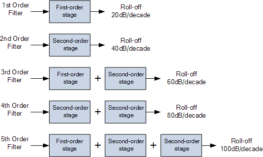 高阶高通有源滤波器,例如第三,第四,第五等,只需将第一级和第二级滤波器级联在一起即可形成。例如,通过级联一阶和二阶滤波器形成三阶高通滤波器,通过将两个二阶滤波器级联在一起形成四阶高通滤波器,依此类推。