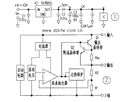 图2是三端稳压器的内部结构框图,内部高增益放大器为负反馈放大器,若输出侧的电容器容量不合适,就容易产生振荡。结果,将C2换成0.1 N.F,电路工作立刻正常了。由此得出一个教训:大凡电源用IC,其内部多含有运放,其工作状态与高增益的模拟放大器相同,一定要按公司手册指定的容量安装电容器,以免产生振荡。
