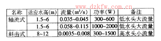该发电机组可以安装在水轮机外壳上端,外壳罩着水轮,此水轮为十二瓣鼓形水叶组成,高压喷水枪与水轮成斜角,高压强的水流喷出时冲击水轮高速转动,带动强磁转子同步运转,定子线圈切割磁力线产生电压,水枪有水阀调控水流量。另斜击式机组的发电机,如果接上220V/5W 灯泡,用手转动水轮,灯泡便能发光。因此可以单独拆出改装成手摇捕鱼机或风力发电机,也可作学校物理教学演示实体。 根据水轮机下水口尺寸,用水泥混凝土砌好基礅,中间开一个与底腔相当的排水管,此管可以是敞开式也可为封闭式,类似于小炉灶,排水管与排水渠相通,砌礅同时装好固定机座的螺丝。根据进水管直径大小购回长度与水头相当的铁管或PVC、胶管制作成压力管,高度越高压力越大,有条件的最好做成上大下小,这样效果更好。把水管与水轮机进水管连接起来,上端进水管与进水渠出水口用水泥固定并密封。水管中段用木架支撑,放水开机时,先关闭水阀用塑料袋包好发电机,以防水管漏水淋湿,待无漏水后再开水阀运转发电。运转后如发现灯泡不够亮,检查压力管是否较大。各种水轮机技术数据参照附表。