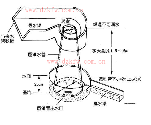 如下图所示,利用水流漩涡强吸力驱动多叶螺旋桨,内轴连接螺旋桨与发电机转子同步运行,外轴连接发电机外壳与水轮机导水罩。水轮机在下,发电机在上,垂直安装在涡室出水口。出水口下接上小下大的圆锥形密封管,要求不能漏气。下出水口浸没水中形成真空,当开闸时水从导水渠进入涡室,由于涡室的作用打着水漩涡,从水轮机导水罩外围绕圈冲入并迅速下坠,形成较大的漩涡吸力,驱动螺旋桨,带动转子运转发电。制作安装时,请电焊工根据水轮机出水口尺寸做一个上小下大,相当于水头高度的圆锥管,材料用6mm的冷轧板,下直径等于两倍上直径,上直径与水轮机出水口相同,圆锥管底边开三个与进水口大小相同的缺口,作出水用。此出口高度尽量在10cm~15cm左右,还要被基坑积水浸没,圆锥管底边沿用钢筋铁圈加固,以防承重翘起。加固后,焊上三个钻好螺丝孔L形角铁作固定用,圆锥管制好后能刚好套进轴流机组的出水管。再根据图纸提供的尺寸焊好涡室,涡室底边上沿对称焊三个L形角铁作固定机组用,以上制作完成后,在选址处平整地面,预挖深35cm的基坑及排水渠排水并用水泥作硬底化处理。排水渠要高于圆锥管出口15cm,才可保持基坑积水浸没圆锥管出水口,铁板导水渠与来水渠交接处用水泥浆密封安装栅栏和水闸以隔树叶垃圾及停机保养用。安装时发电机在上水轮机在下,垂直套进圆锥管的进水口并用铁线把水轴轮机外轴与三个角铁固定。发电时开闸引水进入涡室,发电机转动,待运转稳定后再接上开关用电(安装示意见下图)。