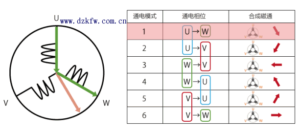 图3所示的是通电相与合成磁通量的关系。在该例中,按顺序从1-6变更通电模式,则合成磁通量将顺时针旋转。通过变更合成磁通量的方向,控制速度,可控制转子的旋转速度。将切换这6种通电模式,控制电机的控制方法称为“120度通电控制”。
