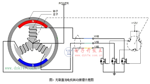 如图所示为无刷直流电机的转动原理示意图,为了方便描述,电机定子的线圈中心抽头接电机电源 POWER,各相的端点接功率管,位置传感器导通时使功率管的 G极接 12V,功率管导通,对应的相线圈被通电。由于三个位置传感器随着转子的转动,会依次导通,使得对应的相线圈也依次通电,从而定子产生的磁场方向也不断地变化,电机转子也跟着转动起来,这就是无刷直流电机的基本转动原理——检测转子的位置,依次给各相通电,使定子产生的磁场的方向连续均匀地变化。