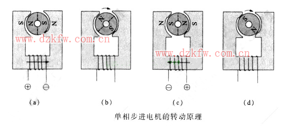 单相步进电机是在一个线圈骨架上缠绕环形线圈,给它通以正负交变的电流,每切换一次电流就按固定方向走一步。由于转子磁路所通过的磁导(磁阻的倒数,表示磁通流过的容易程度)变大为其转动方向,故单相步进电机只能按一个方向运动。为使转动方向确定,磁导采取了多种措施,例如使定子磁极宽于转子,定子与转子之间的工作气隙不均匀,转动方向为磁阻小的方向。下图为单相步进电机的转动原理。