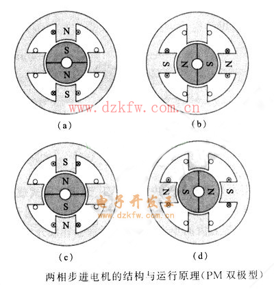 上图表示两相步进电机的结构(PM型)及其运行原理,从图(a)到图(b)顺时针旋转90°,依次图(c)、(d)均旋转90°,依次不断运转成为连续旋转。